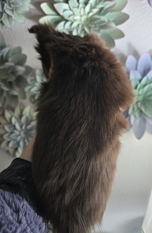 Truffles is a precocious, sweet, smart, loving little lady. She is curious about everything and scared of nothing. She is fluffy "chocolate truffle" that loves to play and snuggle.